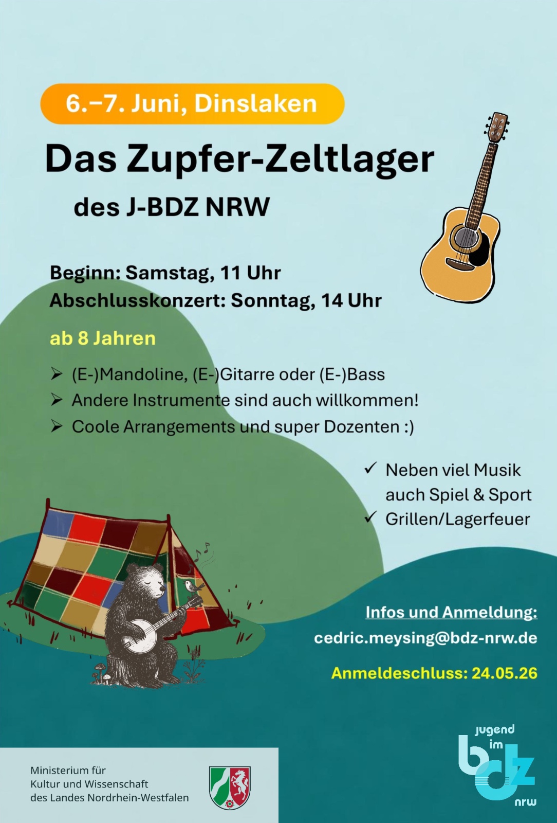 Bitte meldet euch bis zum 24.05.2026 per Mail an cedric.meysing@bdz-nrw.de an und teilt uns neben Namen, Alter, Adresse, Kontaktdaten, ggf. Allergien/Besonderheiten auch mit, welches Instrument ihr spielen wollt und ob ihr ein eigenes Zelt mitbringt oder einen Schlafplatz benötigt.