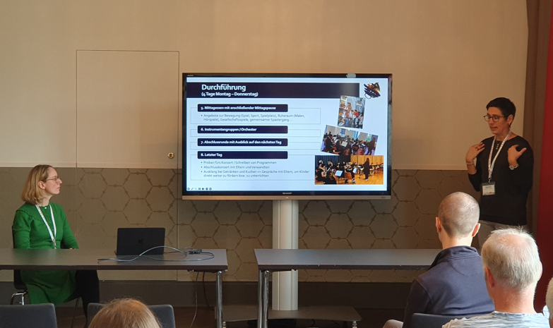 Nach der Mittagspause bot der Info-Workshop: ZupfZauber ist keine Zauberei vom Mülheimer Zupforchester interessante Anregungen zur Nachwuchsgewinnung über ein städtisches Ferienportal. Die Dozentinnen Stefanie Hackner und Monika Oesterwind referieren aus eigener Erfahrung,